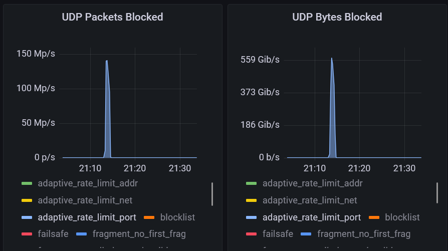 Graphical representation of our adaptive filtering feature's efficiency: demonstrating significant blocking of both UDP packets and bytes to combat DDoS attacks.
