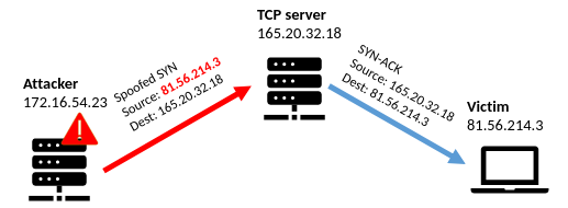 Another method, which has become more prominent over the past year, is referred to as TCP reflection. In this attack, the attacker sends forged TCP SYN packets to a legitimate server. These forged packets have the source IP address spoofed to that of the victim's. Once the spoofed SYN packet arrives at the server, it has no way of knowing that the source IP address stored in the IP header does not actually belong to the sender. The server replies to the host with a SYN-ACK packet. In this case, the host is the victim, and it receives unwanted traffic from a completely legitimate device. This is called reflection because the attacker has used another host to bounce its request off of, and from there reflected it to the victim. When this is happening tens or hundreds of thousands of times per second, the target can easily be flooded with too much attack traffic that it cannot accept legitimate traffic, thus causing a Distributed Reflected Denial of Service (DRDoS). The most common devices to be used as reflectors (the hosts bouncing the traffic to the victim) are usually webservers, but it can also be SMTP servers or any other TCP service.